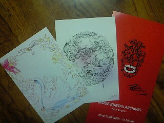 一旦その場を離れて他展示物やお土産などを見て回って、もう一度井上さんの所で絵はがきを買うべく見てたら、ご本人がいらっしゃる~(;^_^Aで、お声かけていただきまして、そこから少しばかり絵の事やブログの事なんかのお話させてもらいまして、その時井上さんは、ブログにコメントしてもらうのが嬉しいんですと言ってらして、ちょっとでもコメントさせてもらってて良かったんだとこちらも嬉しくなっちゃいましたo(^-^)o凄く気さくにお話して下さる素敵な方でした。なんかハイタンとこの方がほんわか喋ってるのを想像してしまった。
