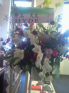 場所は別館の入り口入ってすぐのスペースでこじんまりとありまして、その時私1人で見ていたので、そこにいらっしゃった方が、いろいろなお話をして下さいました。絵の事はもちろんテレビ番組出演も年内あるとゆう事と25日から28日関西テレビ限定のCMもあるとゆうお話もして下さって、入り口にHYDEさんからお花が届いていたので写真撮っもよいかお聞きしたら、どうぞどうぞと。で、その方実は最初HYDEさんがどうゆう方か知らなくて~なんて話しからちょっと又お話なんかしたりして楽しかったです(笑)白髪の素敵な紳士でした。ありがとうございました(*^_^*)