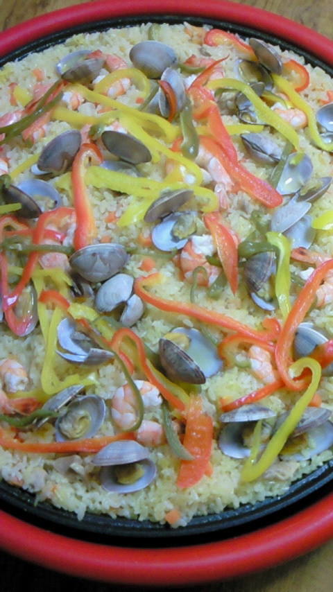 晩ご飯に、栄さんレシピのパエリアを作ってみました。ちゃんと炊き上がるかドキドキしながら(笑)